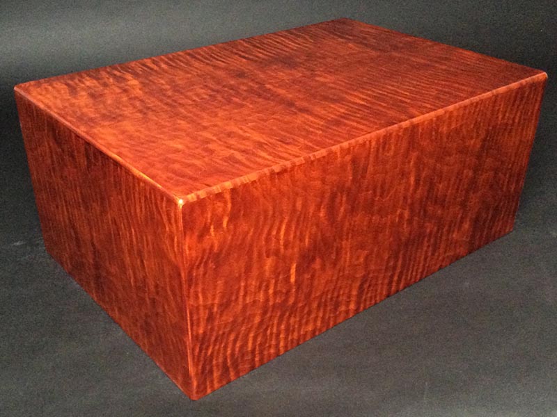 Model #76BFrom the Soft Maple family of Maples this hardwood is of medium density and provides an artist's pallet for adding color. It is bone white and can easily be stained a variety of colors unlike any other hardwood on earth. The curl figure varies in degree from a light curl to a heavy tiger maple with flamed maple in between. Speculative cause of the curl is the wind which causes the tree to sway continuously while growing - causing the cross-grain striations in the wood. It is difficult to machine and chips up easily when planed. It needs to be sanded with TLC. It's growing range is from the Midwest to the Eastern Appalachians of the U.S. It is traditionally used in musical instruments - guitars, violins, mandolins and banjos. We are proud to use this species in our line of fine quality cigar humidors.