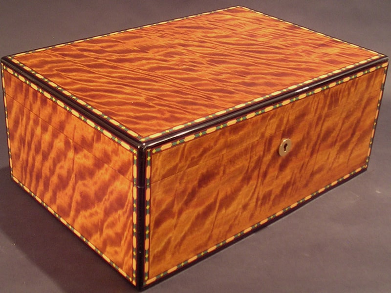 This beautiful humidor is our top of the line model and is available by custom order only. It is custom built and usually takes 4-6 weeks for delivery. It has decorative border inlay strips as well as edge binding in a choice of Curly Maple, Ebony or Indian Rosewood. Lots of labor and lots of tender loving care makes this custom built, highly decorative humidor a center piece in any office or home.