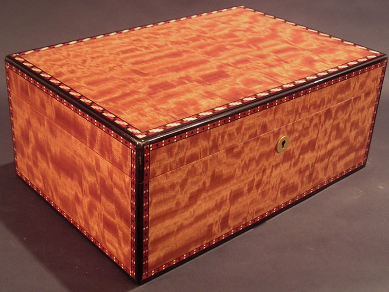 This beautiful humidor is our top of the line model and is available by custom order only. It is custom built and usually takes 4-6 weeks for delivery. It has decorative border inlay strips as well as edge binding in a choice of Curly Maple, Ebony or Indian Rosewood. Lots of labor and lots of tender loving care makes this custom built, highly decorative humidor a center piece in any office or home.