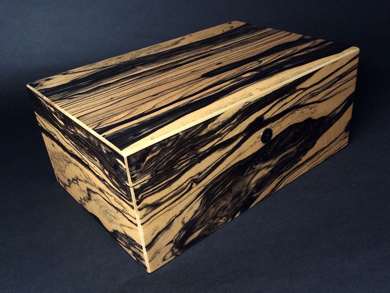 Model #75CWe are introducing this beautiful Golden Ebony wood to replace Spalted Maple. Our stock of Spalted Maple has finally been depleted after almost ten years. We are fortunate to be able to offer this gorgeous Southeast Asian true Ebony. It is a very complex exotic wood and one of the most beautiful we have seen in many years. This wood features jet black in lines on a creamy background. The patterns vary from piece to piece, and no two are alike. It is not currently listed as endangered but is in short supply in the U.S. It is highly valued by guitar builders, cabinetmakers, wood craftspeople and may also be found in the interiors of yachts and private aircraft.