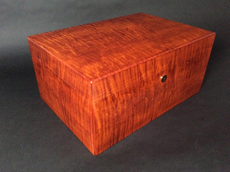 Model #76DFrom the Soft Maple family of Maples this hardwood is of medium density and provides an artist's pallet for adding color. It is bone white and can easily be stained a variety of colors unlike any other hardwood on earth. The curl figure varies in degree from a light curl to a heavy tiger maple with flamed maple in between. Speculative cause of the curl is the wind which causes the tree to sway continuously while growing - causing the cross-grain striations in the wood. It is difficult to machine and chips up easily when planed. It needs to be sanded with TLC. It's growing range is from the Midwest to the Eastern Appalachians of the U.S. It is traditionally used in musical instruments - guitars, violins, mandolins and banjos. We are proud to use this specie in our line of fine quality cigar humidors.